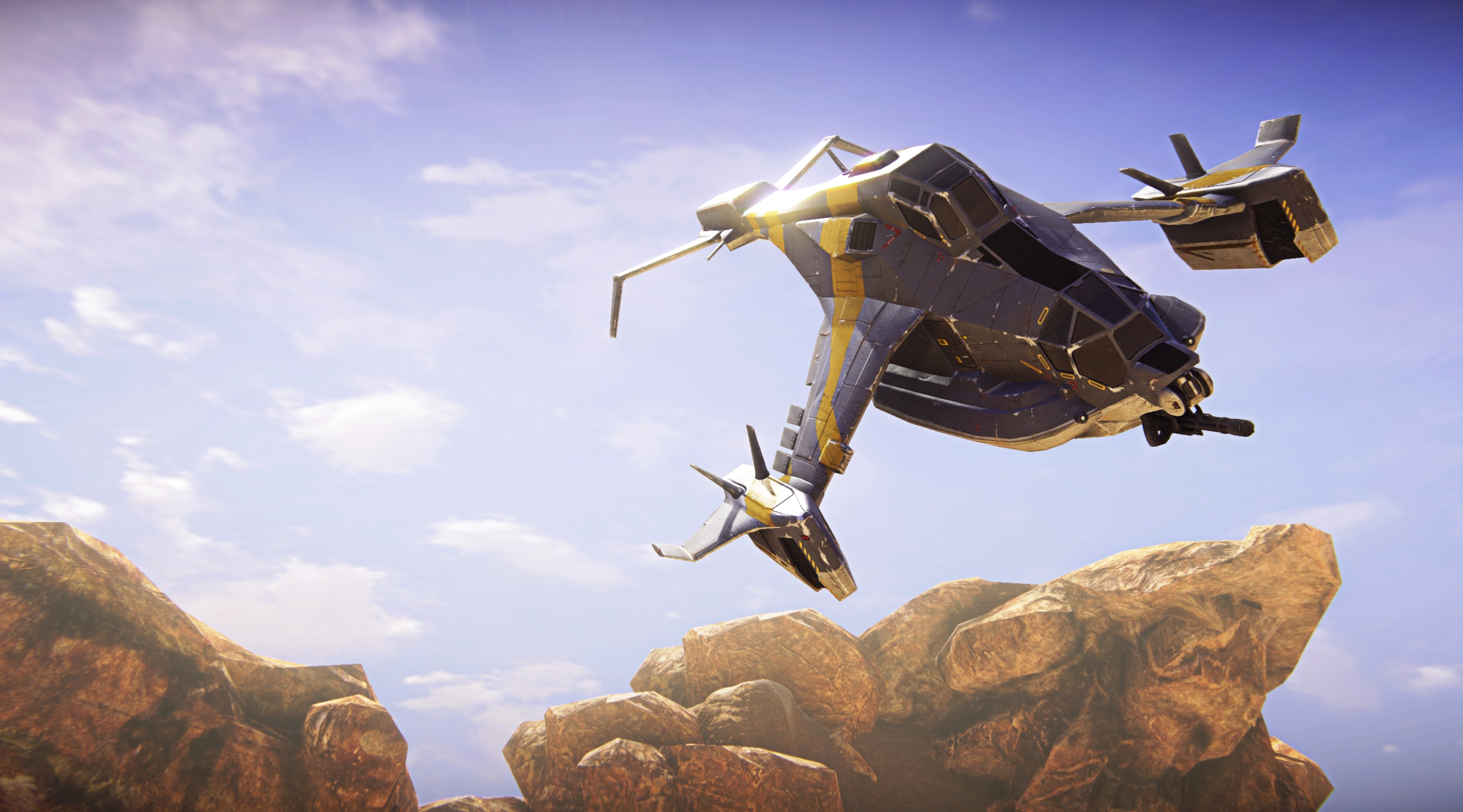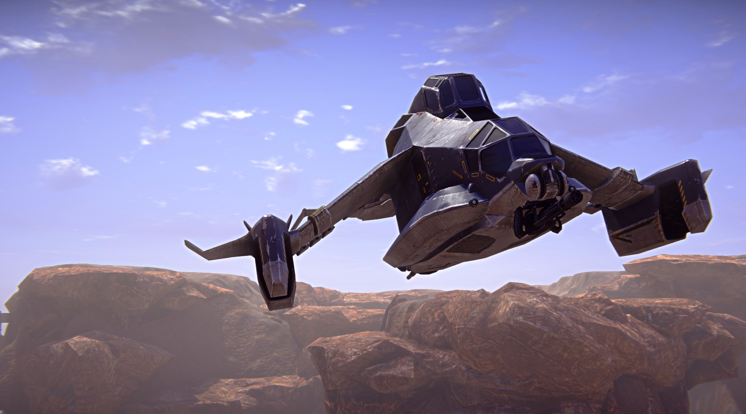 The Liberator is an armored gunship capable of wreaking havoc on ground forces. The primary weapon on the Liberator is a downward facing gun emplacement operated by a passenger. This emplacement has several different options such as an armor devastating 150mm cannon or a shredding 30mm Gatling gun. The pilot also operates a fixed forward nose cannon. While less effective than the primary weapon, the pilots weapon can engage from a farther distance and both weapons used in conjunction can be even more devastating. While it has medium armor the Liberator is slow and particularly vulnerable to enemy air superiority fighters.