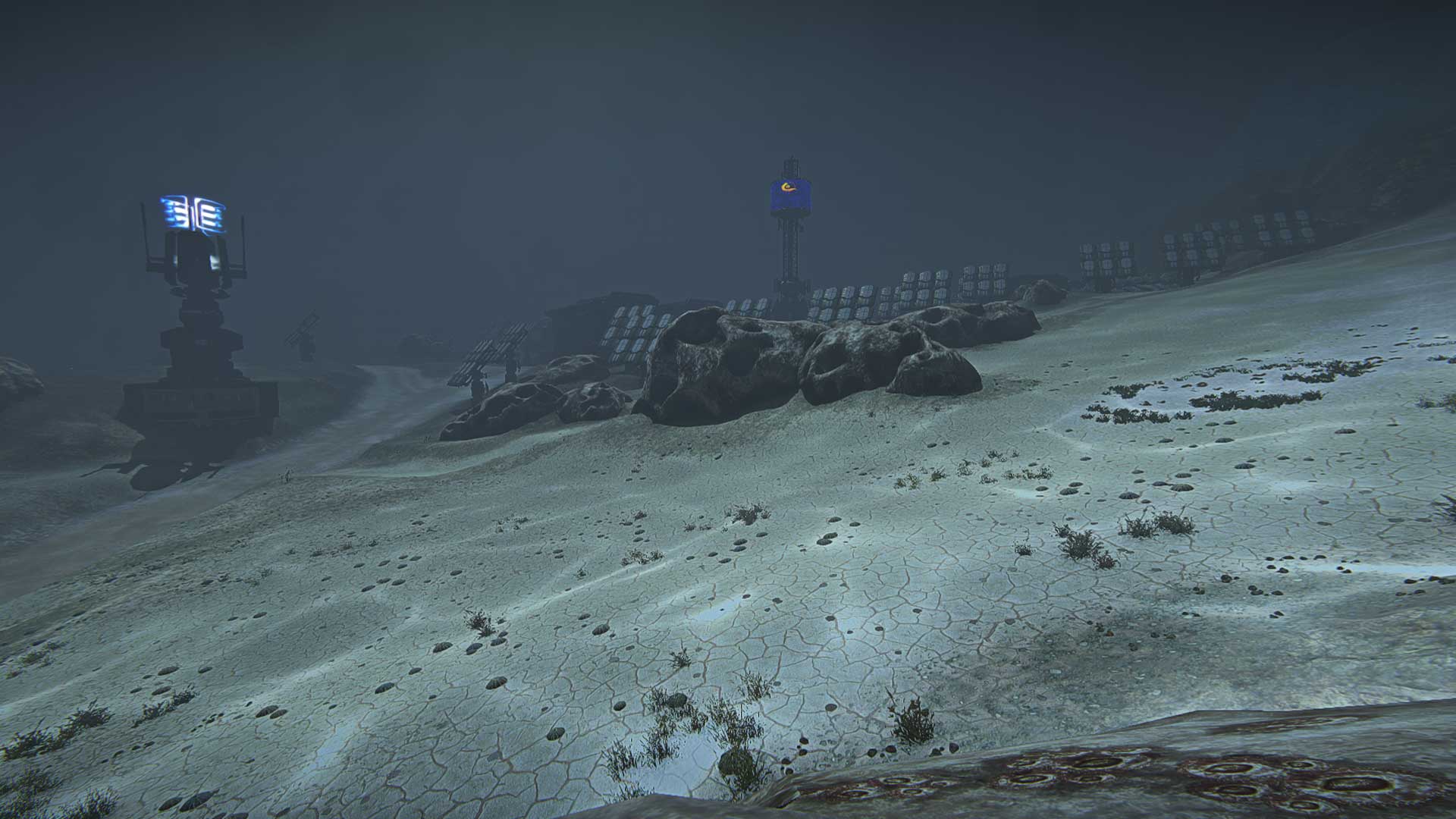 - Fog from the sky is making water at a distance appear hazy and show distant terrain beneath the surface.