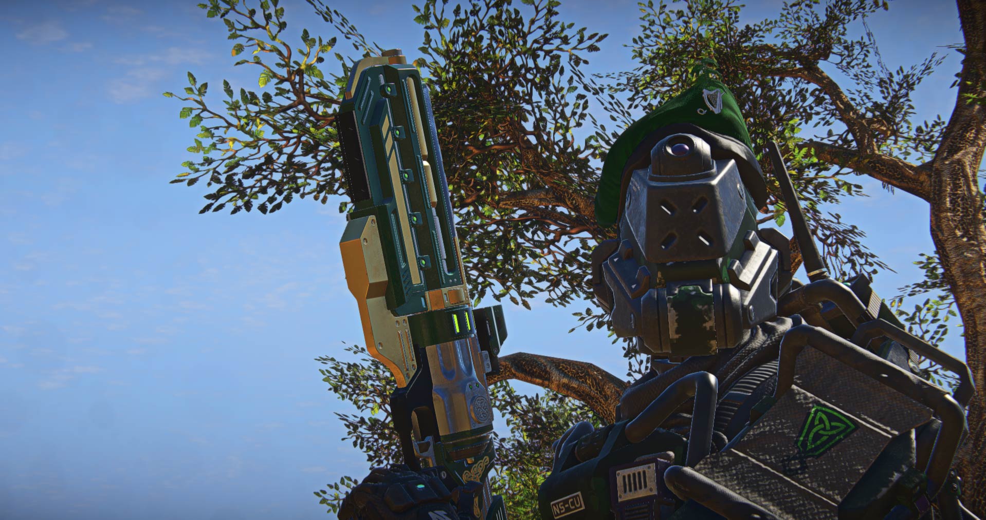 Pictured: Wyrdwood Caubeen, Wyrdwood Decal, Clover Camo, and NS-44 "Jackpot" Commissioner. Classy robot sold separately.