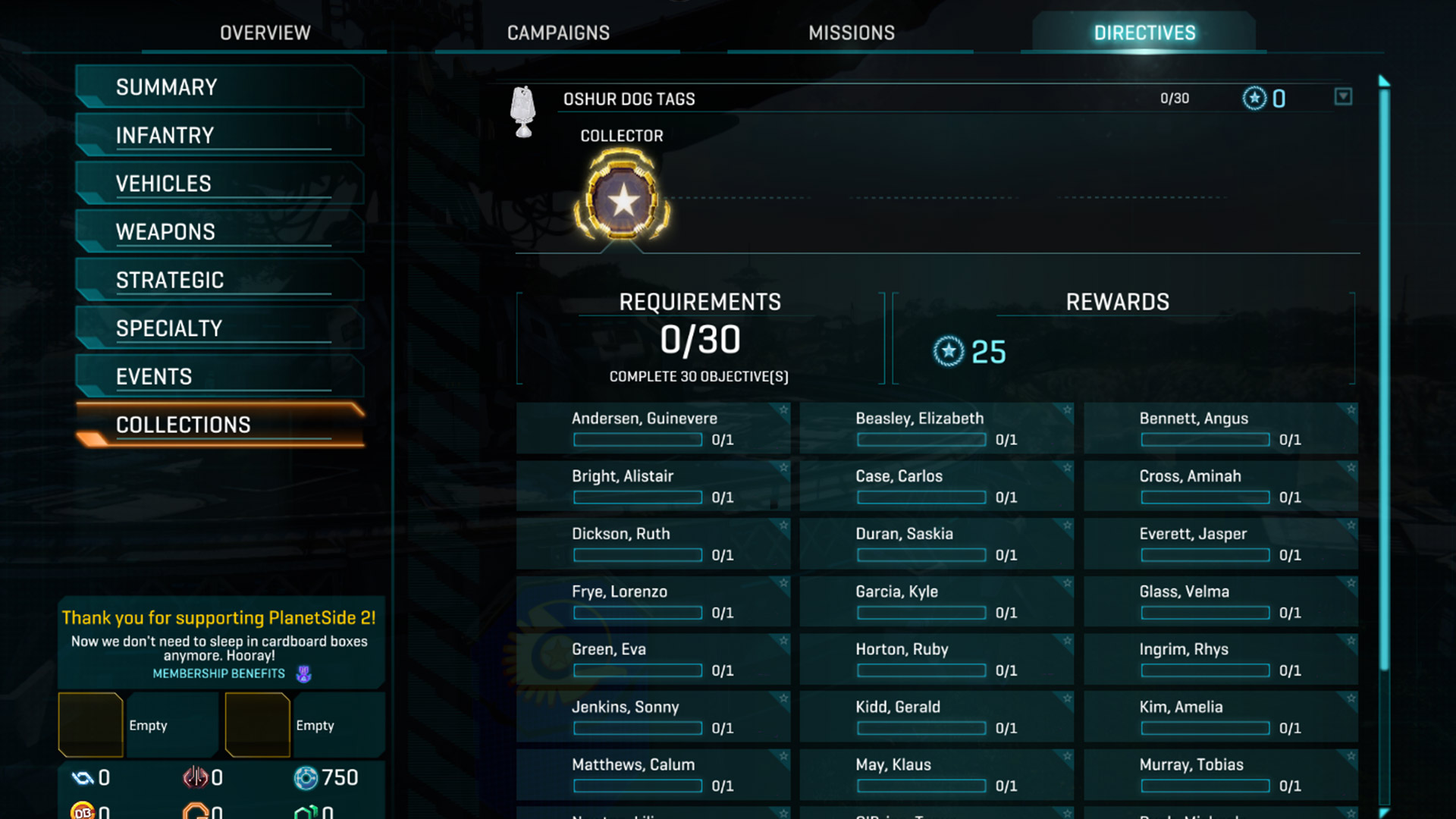 Oshur Collections - A new "Collections" tab can be found in the Directives page. Our first Collections directive asks you to recover the lost dog tags of those who died during the evacuation of Oshur.