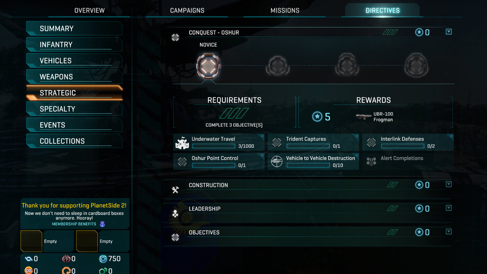 Conquest - Oshur - In the "Strategic" tab, a new directive line dedicated to the war for Oshur has been added. Unlock the new UBR-100 Frogman by completing the first tier, and the (very special) Paradise Camo at Master tier, reserved for only the most hardened veterans.